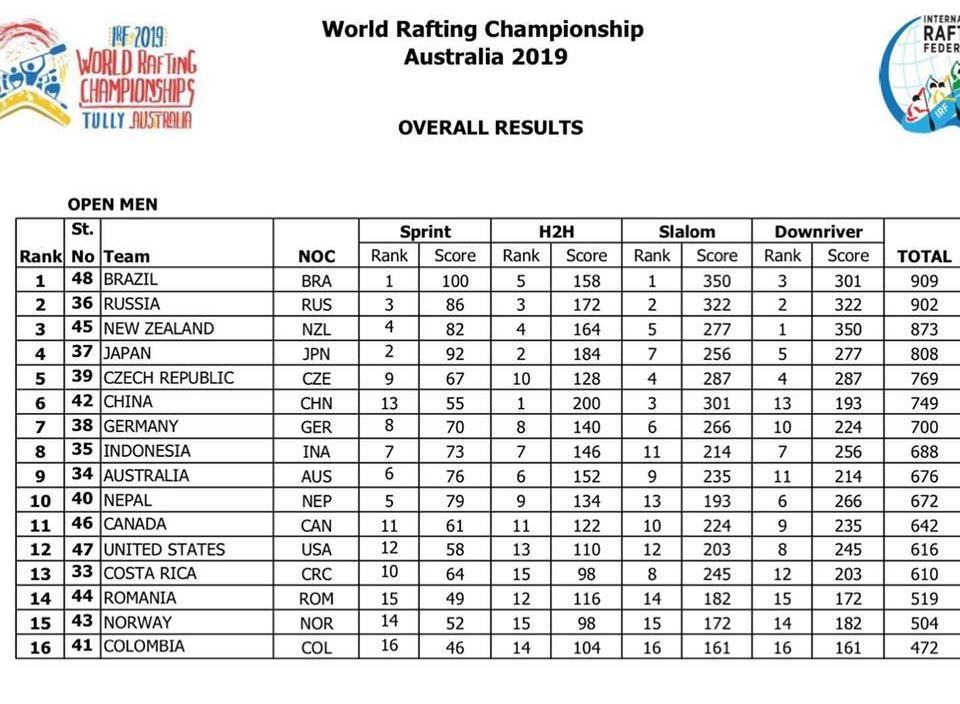 विश्व र्‍याफ्टिङको ओभरअल पोजिसनमा शीर्ष स्थानमा क्रमश : ब्राजिल रसिया, न्युजिल्यान्ड, जापान र चेक रिपब्लीक पाँचौ भए । विश्व र्‍याफ्टिङको स्पिन्ट स्पर्धामा पाँचौ भएको नेपालका लागि अहिलेसम्म ठूलो सफलता हो ।