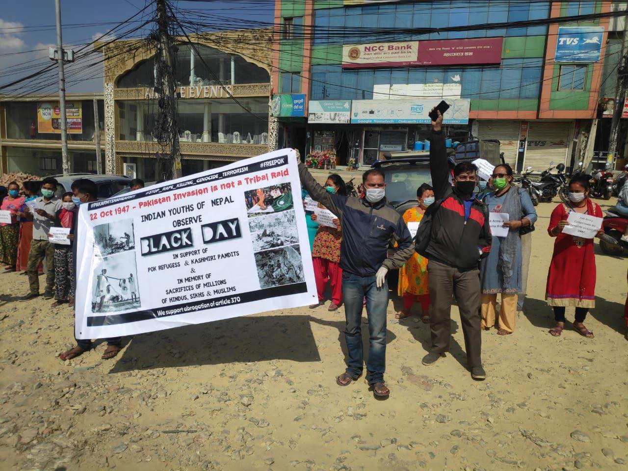 काठमाडाैँकाे महराजगन्जस्थित पाकिस्तान दूतावास अगाडि उनीहरूले र्याली निकालेर विभिन्न नारा लगाउँदै अक्टाेबर २२ तारेखलाई कालाे दिनकाे रूपमा मनाएका हुन् ।