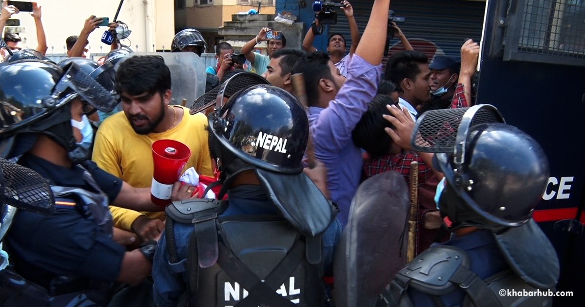 काठमाडौँ- गभर्नर महाप्रसाद अधिकारीको राजीनामा माग गर्दै बालुवाटारमा प्रदर्शन गर्ने नेविसंघ आबद्ध विद्यार्थीहरूलाई प्रहरीले नियन्त्रणमा लिएको छ ।