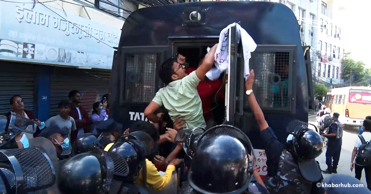 गभर्नर अधिकारीको राजीनामा माग गर्दै बालुवाटारस्थित राष्ट्र बैंक अगाडी कालो झण्डा देखाएर प्रदर्शन गर्न खोज्ने विद्यार्थीहरूलाई प्रहरीले नियन्त्रणमा लिएको हो ।