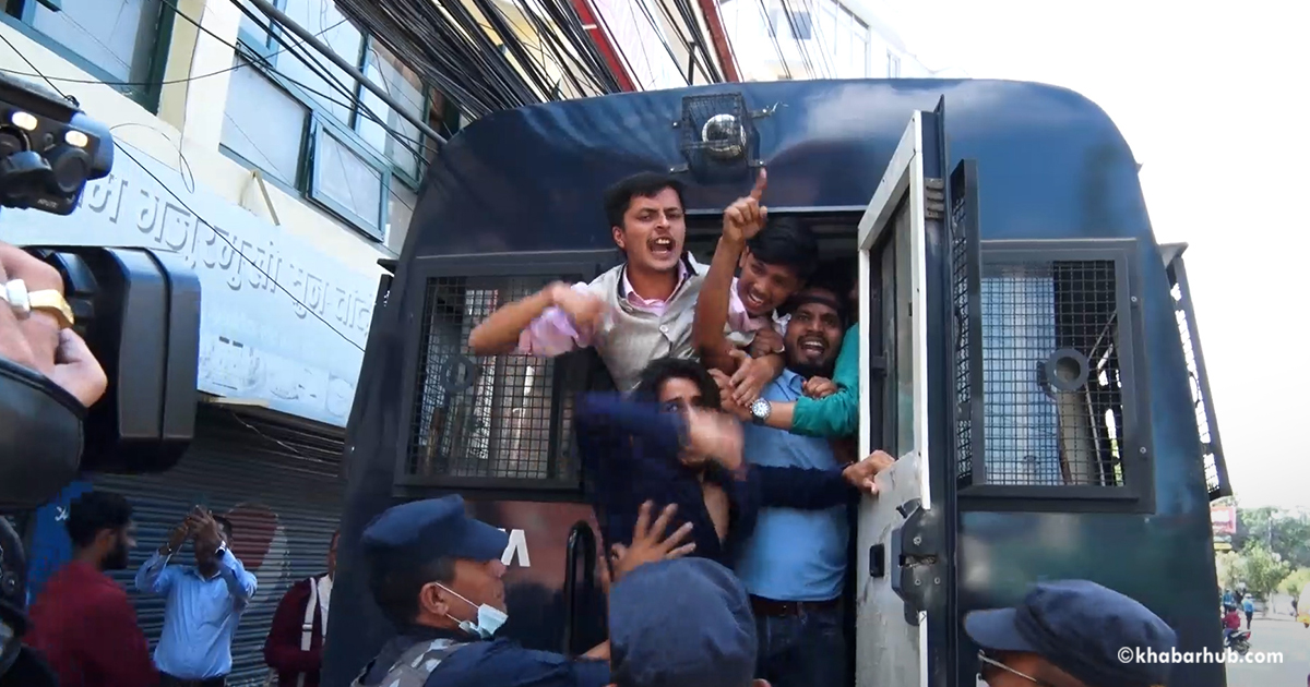 गभर्नर अधिकारीको राजीनामा माग गर्दै बालुवाटारस्थित राष्ट्र बैंक अगाडी कालो झण्डा देखाएर प्रदर्शन गर्न खोज्ने विद्यार्थीहरूलाई प्रहरीले नियन्त्रणमा लिएको हो ।