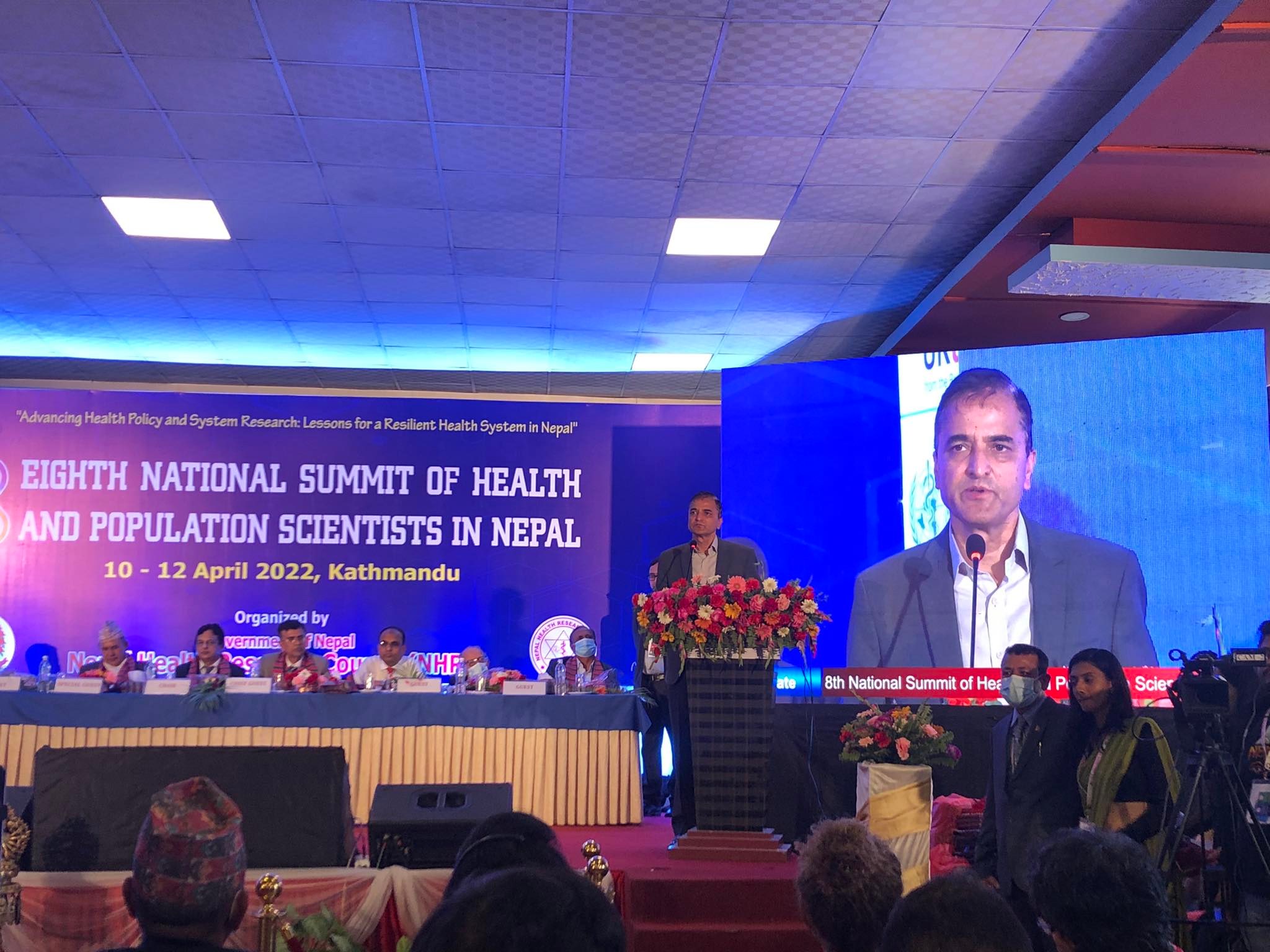 भर्चुअल रुपमा सम्बोधन गरेका उनले कोभिड १९ को महामारीमा बेला नेपालको स्वास्थ्य क्षेत्रले देखाएको क्रियाशिलता उदाहरणीय भएको बताए । उनले नेपालको स्वास्थ्य अनुसन्धानको क्षेत्रलाई थप प्रभावकारी बनाउन सम्मेलन सहयोगी बनोस् भन्दै शुभकामना समेत व्यक्त गरे ।