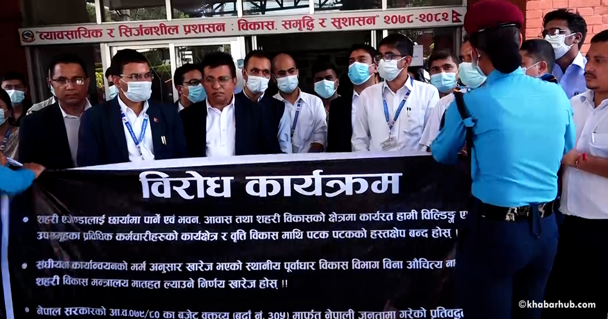 संघीयता कार्यान्वयनको मर्म अनुसार खारेज भएको विभागलाई नाम परिवर्तन गरि मन्त्रालयमा गाभ्ने निर्णय मान्य नभएको भन्दै मन्त्रालयका इन्जिनियरिङ् सेवा सिभिल समुह विल्डिङ्ग एन्ड आर्किटेक्ट उपसमूहका प्राविधिक कर्मचारीहरूले मन्त्रालयमा प्रदर्शन गरेका हुन् ।