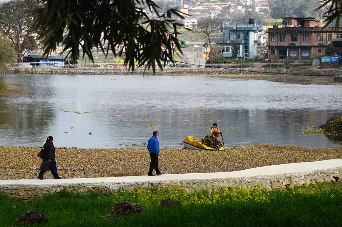व्यवसायीले नागदहको जलकुम्भी चार दिनदेखि निकालिरहेका छन् । दुई जना मजदुरले डुंगाको सहायताले जलकुम्भी झार निकाल्न लगाइएको हो ।