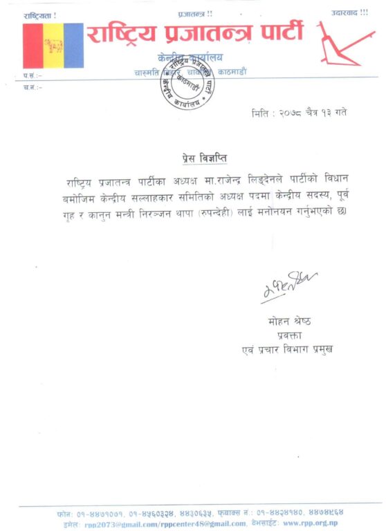 पार्टी अध्यक्ष राजेन्द्र लिङ्देनले थापालाई केन्द्रीय सल्लाहकार समितिको अध्यक्षमा नियुक्त गरेको प्रचार विभाग प्रमुख तथा प्रवक्ता मोहन श्रेष्ठले जानकारी दिए ।