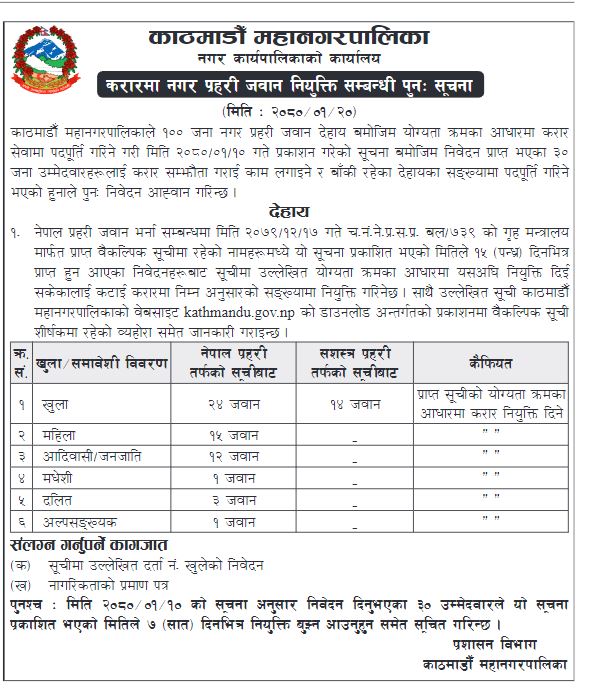 काठमाडौं– काठमाडौं महानगरपालिकाले करारमा प्रहरी भर्ती गर्ने भएको छ ।
