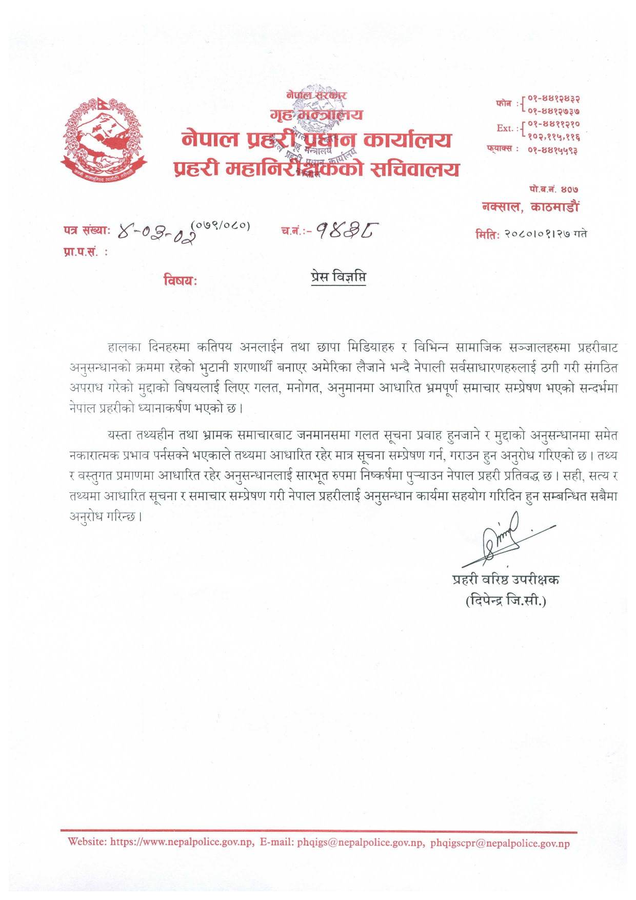 कतिपय अनलाइन, छापा मिडिया तथा विभिन्न सामाजिक सञ्जालमा प्रहरीबाट अनुसन्धानका क्रममा रहेको भुटानी शरणार्थी बनाएर अमेरिका लैजाने भन्दै नेपालीहरूलाई ठगी गरी संगठित अपराध गरेको घटनाको विषयमा गलत, मनोगत र अनुमानमा आधारित भ्रमपूर्ण समाचार सम्प्रेषण भएको भन्दै नेपाल प्रहरीले आफ्नो ध्यानाकर्षण भएको जनाएको छ ।