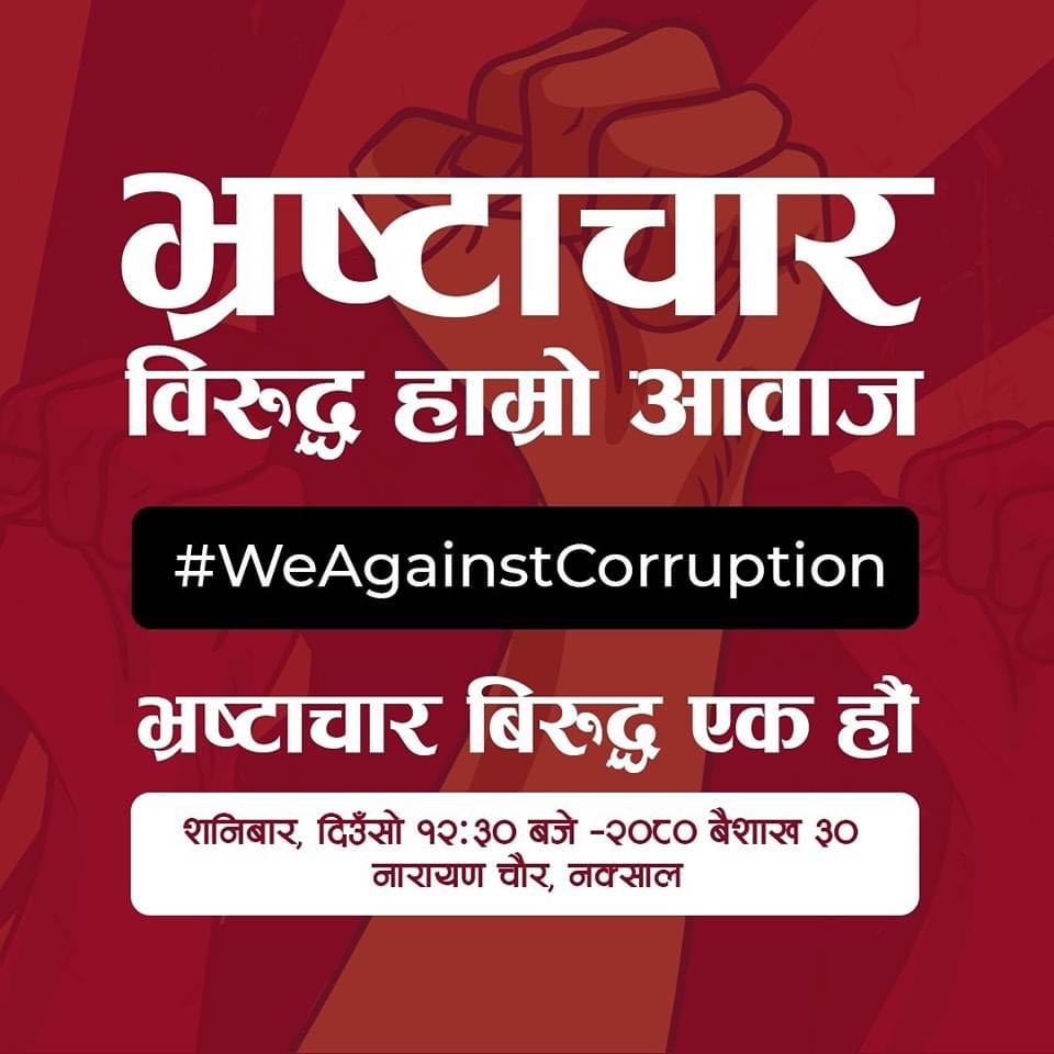 ‘भ्रष्टाचारविरुद्ध एक हौँ’ भन्ने अभियानले दिउँसो काठमाडौं, भैरहवा, पोखरा, सिन्धुलीलगायतका स्थानमा प्रदर्शन गर्न लागेको हो। काठमाडौंको नक्साल नारायणचौरमा दिउँसो साढे १२ बजे प्रदर्शन गर्ने तयारी छ।