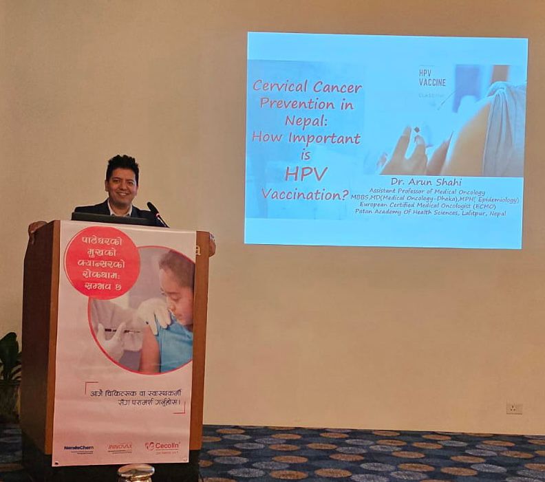 बरिष्ठ क्यान्सर रोग विशेषज्ञ अरुण शाहीले शुक्रबार राजधानीमा आयोजित ‘सर्भाइकल क्यान्सर प्रिभेन्सन इन नेपाल : हाउ इम्पोर्टेन्ट इज एचपीभी भ्याक्सिनेसन?’ विषयक सीएमई विषयक सीएमई कार्यक्रममा बरिष्ठ क्यान्सर रोग विशेषज्ञ अरुण शाहीले कार्यपत्र प्रस्तुत गर्ने क्रममा यसरी विषय उठान गरेका थिए ।