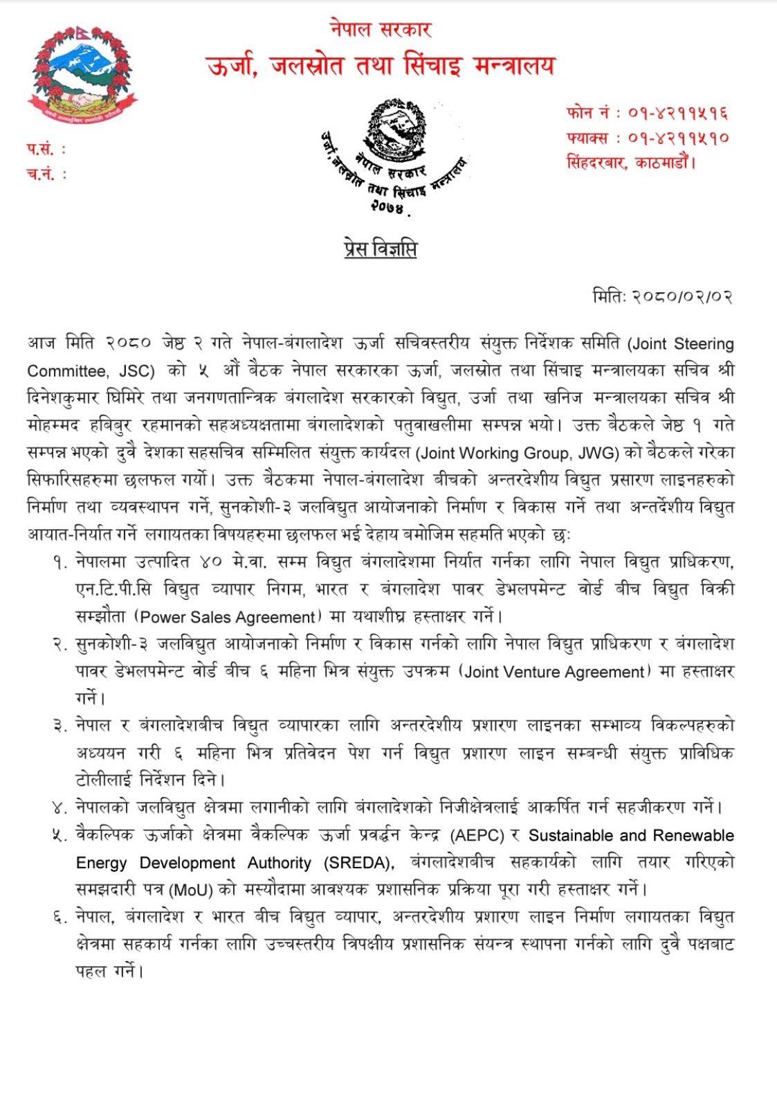 दुई देशबीच भएको सचिवस्तरिय बैठकमा नेपालमा उत्पादित ४० मेगावाट बिजुली बंगलादेशले खरिद गर्ने सहमति भएको हो ।