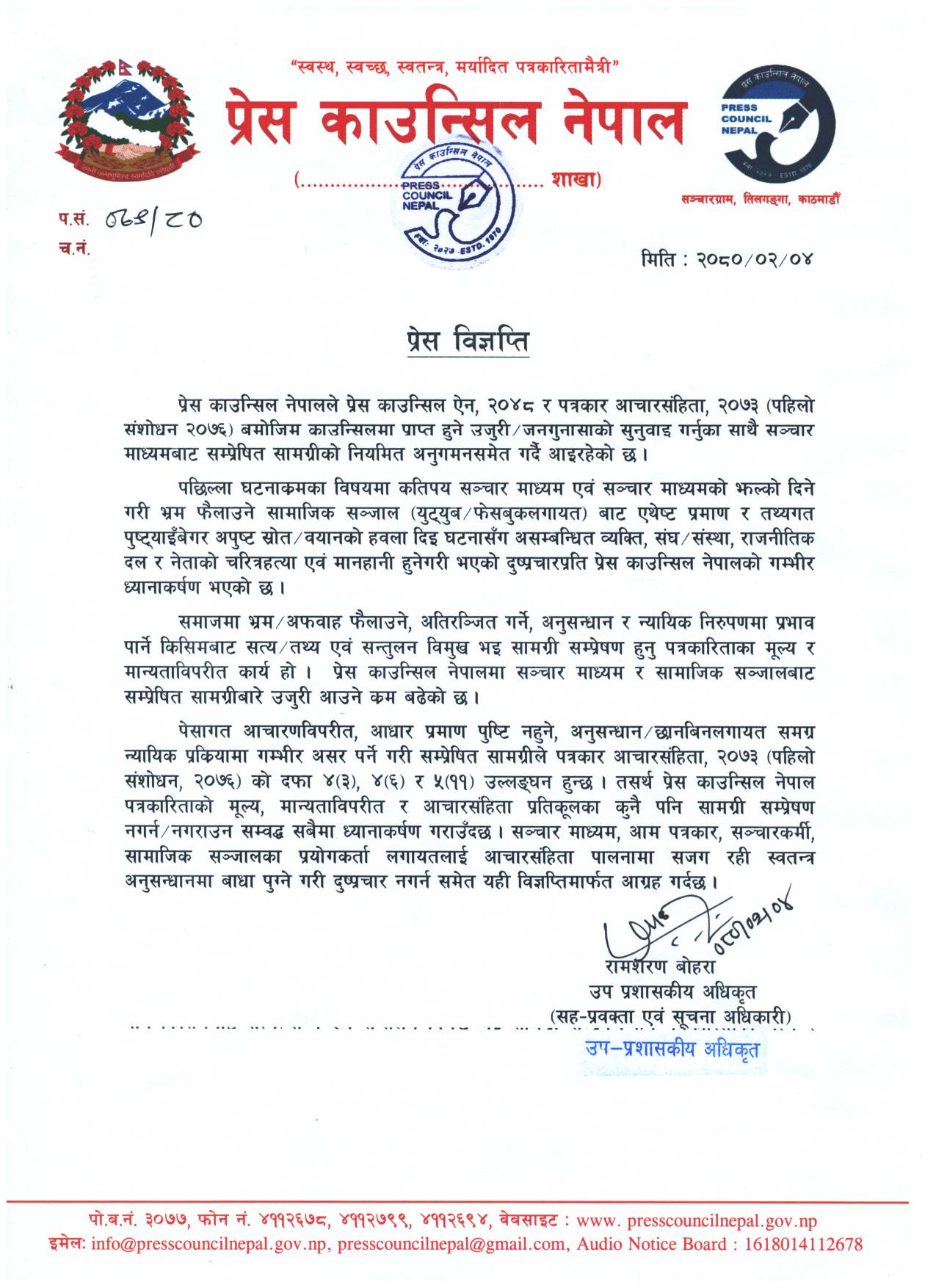 काउन्सिलले एथेष्ट प्रमाणबिना र अपुष्ट स्रोत-बयानको हवला दिई घटनासँग असम्बन्धित व्यक्ति, सङ्घ संस्था, राजनीतिक दल र नेताको चरित्रहत्या एवं मानहानी हुनेगरि भएको दुष्प्रचारप्रति गम्भीर ध्यानाकर्षण भएको जनाएको छ । ‘समाजमा भ्रम-अफवाह फैलाउने, अतिरञ्जित गर्ने, अनुसन्धान र न्यायिक निरुपणमा प्रभाव पार्ने किसिमबाट सत्य-तथ्य एवं सन्तुलन विमुख भइ सामग्री सम्प्रेषण हुनु पत्रकारिताका मूल्य र मान्यताविपरीत कार्य हो ।’ काउन्सिलका उपप्रशासकीय अधिकृत एवं सूचना अधिकारी रामशरण बोहराद्वारा जारी विज्ञप्तिमा भनिएको छ ।