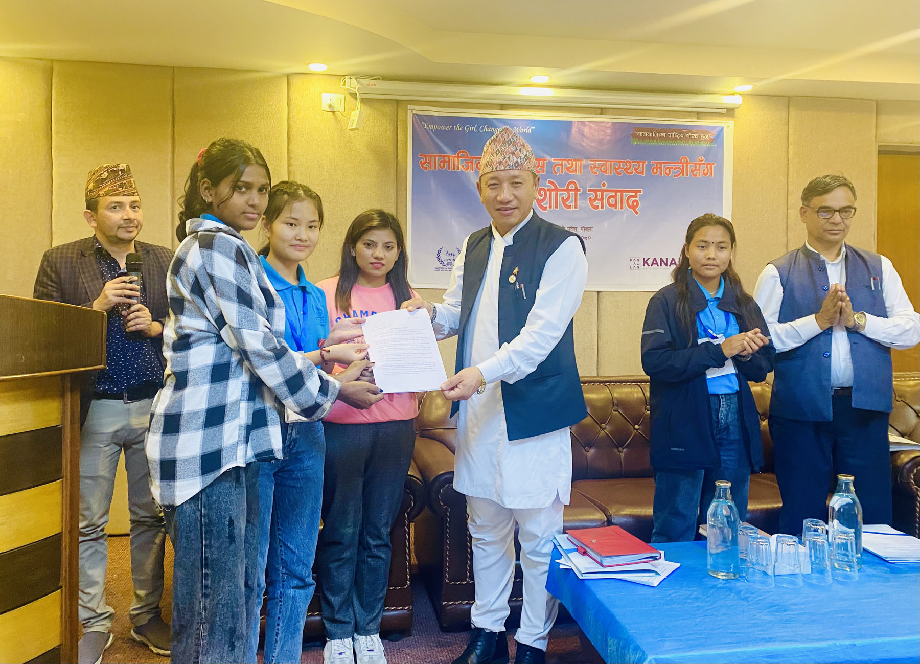 पोखरामा भएको ‘किशोरी संवाद’ कार्यक्रममा किशोरी समूहका प्रतिनिधिले मन्त्री गुरुङसमक्ष ध्यानाकषर्षणपत्र बुझाए । किशोर–किशोरी तथा बालबालिकाको हकहित समेटिएको २२ बुँदे मागसहित मन्त्रीको ध्यानाकर्षण गराइएको हो । ध्यानाकर्षणपत्रमा किशोरीमैत्री शौचालय निर्माणदेखि बालबालिकाको पोषणभत्तासम्मका माग उठाइएको किशोरी अभियानकर्मी शशि कार्की क्षेत्रीले जानकारी दिए । ध्यानकर्षणपत्रको पहिलो बुँदामा किशोरी तथा बालिकाको मानवीय विकास र क्षमता अभिवृद्धिका लागि लगानी वृद्धि गर्न माग गरिएको छ ।