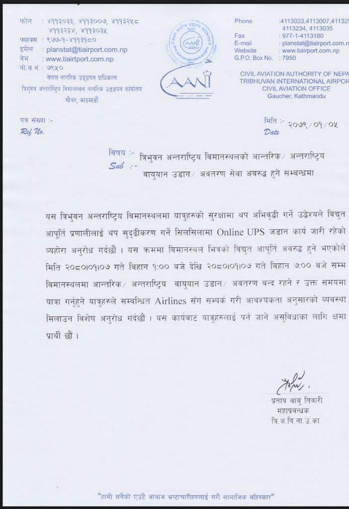 विमानस्थल कार्यालयले एक सूचना प्रकाशित गरी अनलाइन यूपीएस जडान गर्दा विद्युत् आपूर्ति अवरुद्ध हुने भएकोले उडान अवतरण बन्द रहने जनाएको छ ।