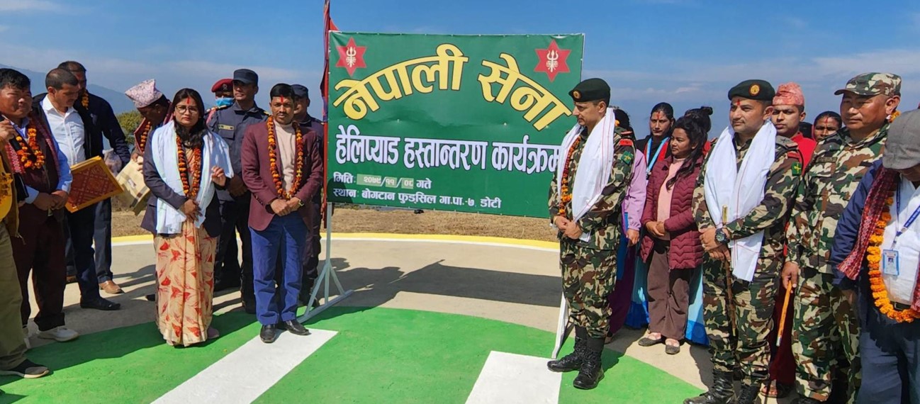 फागुन– डोटीको बोगटान फुड्सिल गाउँपालिका–७ चवराचौतारामा नेपाली सेनाद्वारा निर्माण गरिएको हेलिप्याड गाउँपालिकालाई हस्तान्तरण गरिएको छ । गाउँपालिकासँगको समन्वयमा सिलगढीस्थित भैरवप्रसाद गण डोटीले चालु आर्थिक वर्ष २०७९-०८० मा सीमित कार्यक्रमअन्तर्गत रु पाँच लाख लगानीमा निर्माण गरिएको हेलिप्याडको सोमबार उद्घाटनसँगै गाउँपालिकालाई हस्तान्तरण गरिएको हो । हेलिप्याडको गाउँपालिकाका अध्यक्ष कमलबहादुर गडसिला र भैरवप्रसाद गणका गणपति प्रमुख सेनानी जनमत कार्कीले संयुक्तरूपमा उद्घाटन गरेका हुन् ।