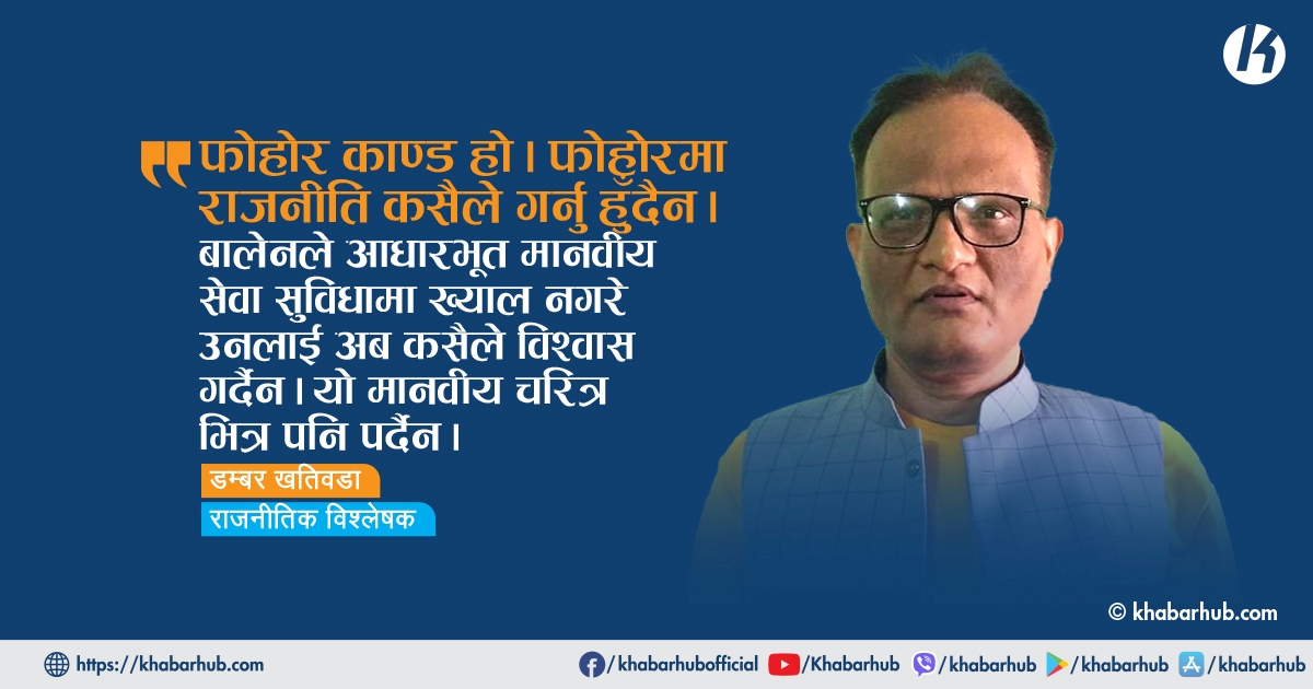 देशमा विभिन्न राजनीतिक विषयको चर्चा भइरहेकै हुन्छ। काठमाडौं महानगरपालिका र संघीय सरकारबीचको द्वन्द्व अहिले चर्किएको विषय बनेको छ। उपनिर्वाचन र काठमाडौंका मेयर बालेन्द्र (बालेन) शाहको सिंहदरबारलाई नटेर्ने प्रवृत्तिको चर्चा अहिले आम रुपमा भइराखेको छ। देशका तीन निर्वाचन क्षेत्रमा उपनिर्वाचनको मौन अवधि सुरु भइसकेको छ। समसामयिक राजनीतिक विषय, महानगर र संघीय सरकारबीचको द्वन्द्वका विषयमा राजनीतिक विश्लेषक डम्बर खतिवडासँग राजु थापाले गरेको कुराकानी सम्पादित अंश :