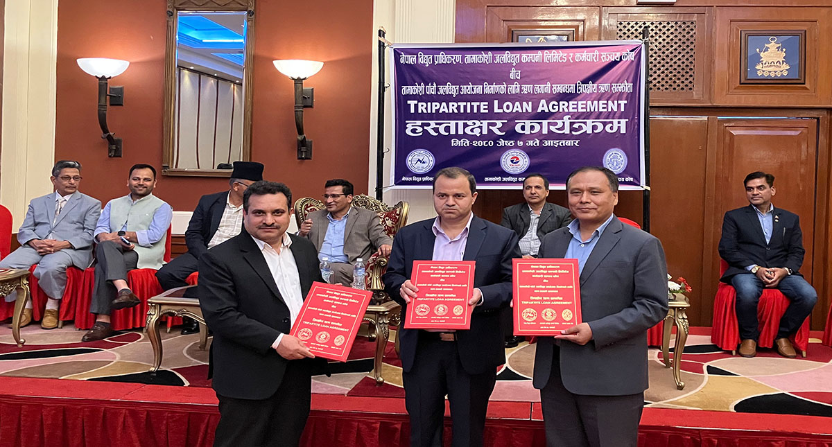 ऊर्जा, जलस्रोत तथा सिँचाइमन्त्री शक्तिबहादुर बस्नेतको उपस्थितिमा आइतबार नेपाल विद्युत् प्राधिकरण, आयोजनाको प्रवर्द्धक तामाकोसी जलविद्युत कम्पनी र कर्मचारी सञ्चय कोषबीच त्रिपक्षीय ऋण सम्झौतामा हस्ताक्षर भएको छ। प्राधिकरणका कार्यकारी निर्देशक कुलमान घिसिङ, कोषका प्रशासक जितेन्द्र धिताल र कम्पनीका प्रमुख कार्यकारी अधिकृत (सीईओ) विनोद भण्डारीले सम्झौतामा हस्ताक्षर गरेका छन्।