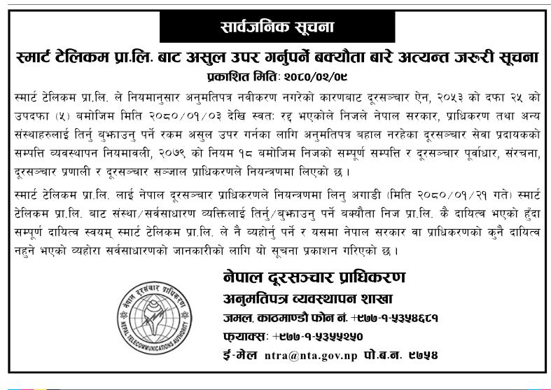 ‘स्मार्ट टेलिकम प्रालिलाई नेपाल दुर सञ्चार प्राधिकरणले नियन्त्रणमा लिनु अगाडी (२०८० वैशाख २१ ) स्मार्ट टेलिकम प्रालिबाट संस्था वा सर्वसाधारण व्यक्तिलाई तिर्नु/बुझाउनु पर्ने बक्यौता निज प्रालिको दायित्व भएको हुँदा सम्पूर्ण दायित्व स्वयम स्मार्ट टेलिकम प्रालिले ब्यर्होनु पर्ने र यसमा नेपाल सरकार वा प्राधिकरणको कुनै दायित्व नहुने भएको ब्यहोरा सर्वसाधारणका लागि यो ब्यहोरा जानकारी गराइन्छ’ प्राधिकरणले जारी गरेको सूचनामा भनिएको छ।