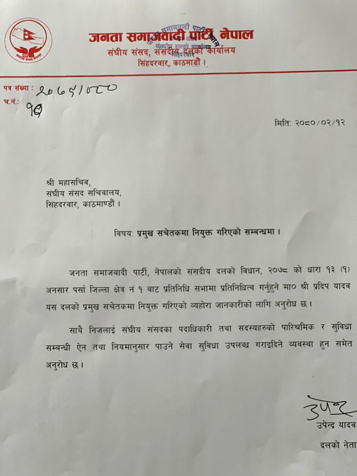 प्रमुख सचेतकमा नियुक्त भएका प्रदीपलाई संघीय संसद्का पदाधिकारी तथा सदस्यहरूको पारिश्रमिक र सुविधासम्बन्धी ऐन तथा नियमानुसार पाउने सेवा सुविधा उपलब्ध गराइदिन अध्यक्ष यादवले संघीय संसद्का महासचिवलाई पत्र लेखेका छन् ।