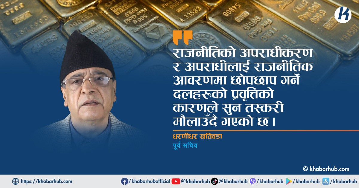 गत मंगलबार त्रिभुवन अन्तर्राष्ट्रिय विमानस्थलको भन्सार जाँच पास पुरा गरेर बाहिर निस्किसकेको करिब सय किलो सुन बरामद भएको छ। यस्ता शृङ्खला पहिला पनि भएको र गुपचुप रूपमा ठुलो परिणाममा सुन भित्रिरहेको भन्ने कुरा आइरहेको छ। नेपालमा यस्तो सुन तस्करीको खास कुरा कसले ल्याइरहेको छ ? यस्तो विषयमा किन समातिन सकेको छैन लगायतका विषयमा आधारित रहेर पूर्व सचिव धरणीधर खतिवडासँग सुशील पाण्डेले गरेको कुराकानीको सम्पादित अंश :