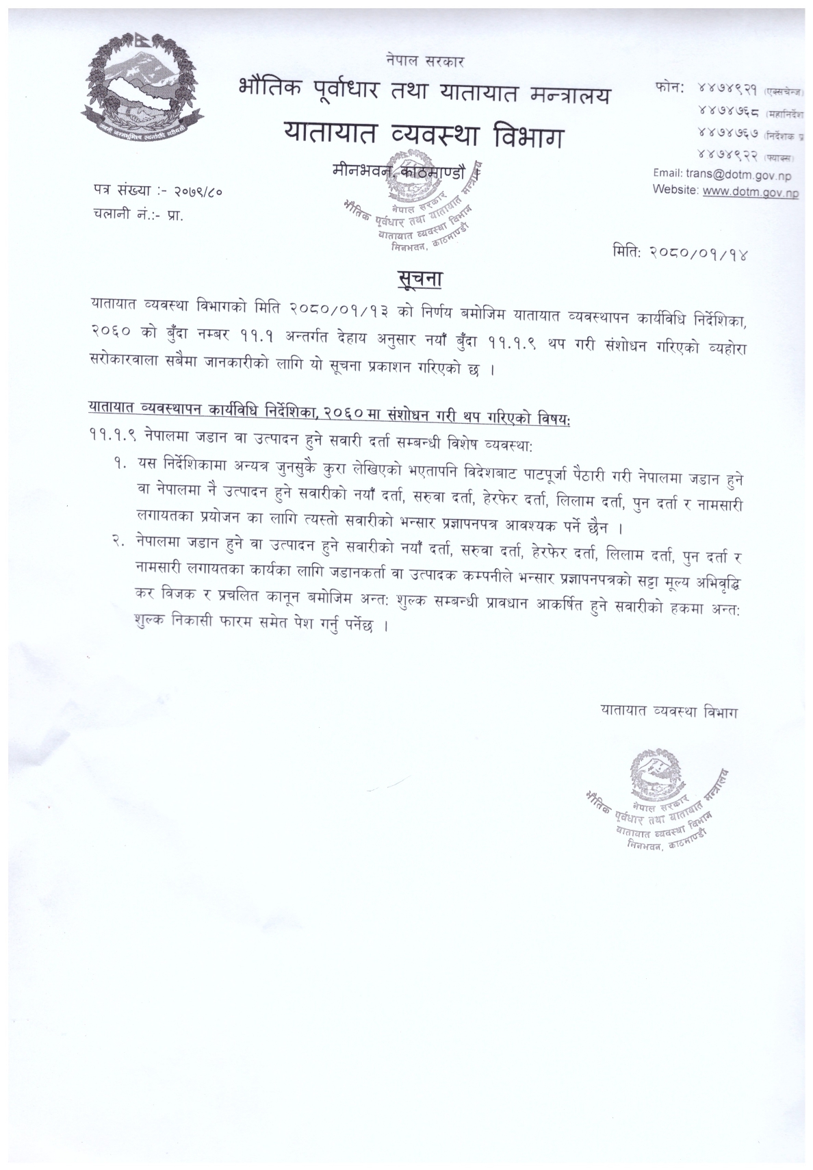 यातायात व्यवस्थापन कार्यविधि निर्देशिका २०६० मा संशोधन गर्दै नेपालमा जडान वा उत्पादन भएका सवारी दर्ता सम्बन्धी व्यवस्था गरेको विभागले जनाएको छ ।  यातायात व्यवस्थापन कार्यविधि निर्देशिका २०६० को दफा ११.१ अन्तर्गत नयाँ बुँदा ११.१.९ थप गरेको हो।