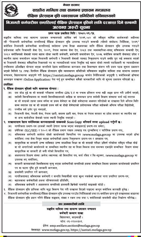 कर्मचारीका सन्तत्तिलाई उच्च शिक्षाका लागि उपलब्ध गराइँदै आएको शैक्षिक प्रोत्साहन वृत्ति पुनः सुचारु गर्ने सरकारको निर्णय पछि मन्त्रालयले सूचना निकालेर १५ दिनभित्र आवेदन दिन आह्वान गरेको हो।