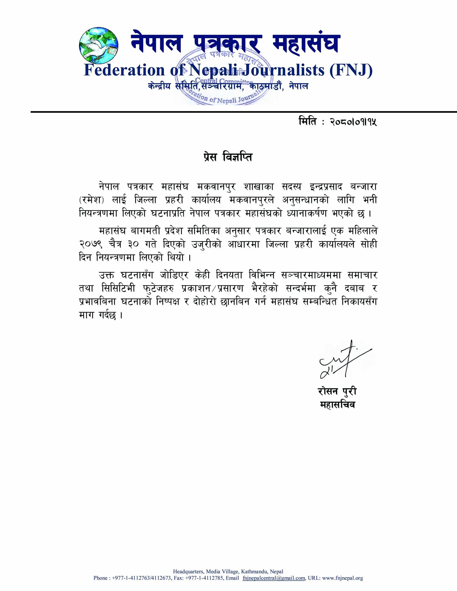 पत्रकार बन्जारालाई एक महिलाले २०७९ चैत्र ३० गते दिएको उजुरीको आधारमा जिल्ला प्रहरी कार्यालय मकवानपुरले अनुसन्धानको लागि भनी नियन्त्रणमा लिएको घटनाप्रति महासंघले ध्यानाकर्षण भएको जनाएको हो ।