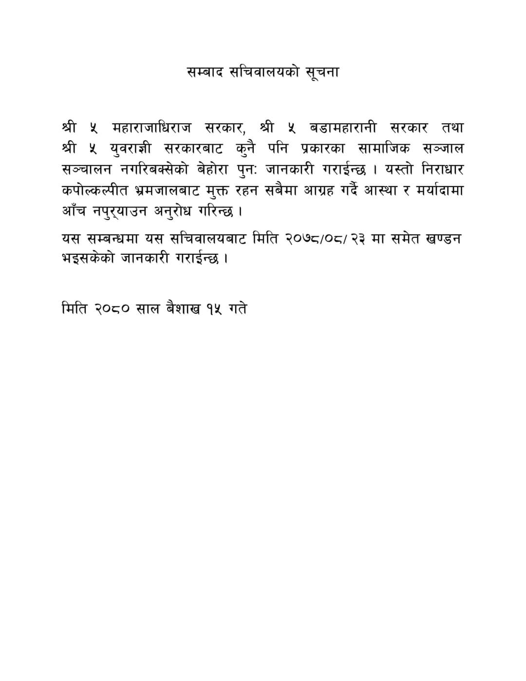 यसअघि २३ मंसिर २०७८ मा पनि सचिवालयले पूर्वराजा शाह, पूर्वरानी कोमल र पूर्वयुवराज्ञी हिमानीले सामाजिक सञ्जाल सञ्चालन नगरेको जानकारी गराइसकेको स्मरण गराएको छ ।