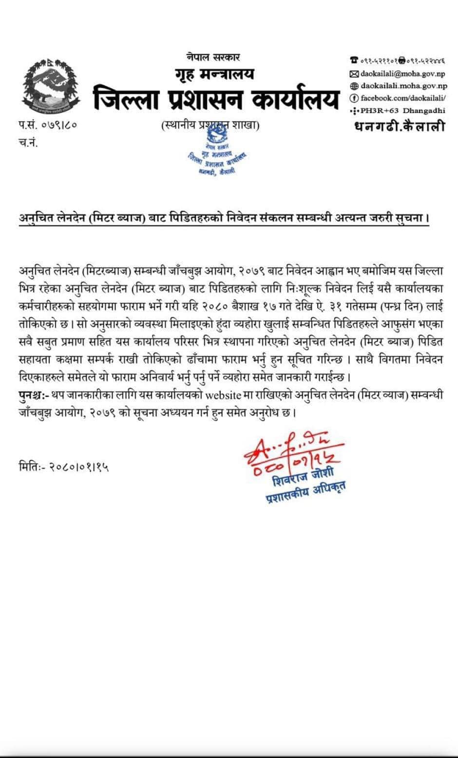 धनगढी– जिल्ला प्रशासन कार्यालय कैलालीले मिटर ब्याज सम्बन्धी उजुरी दिन शुक्रबार आह्वान गरेको छ।