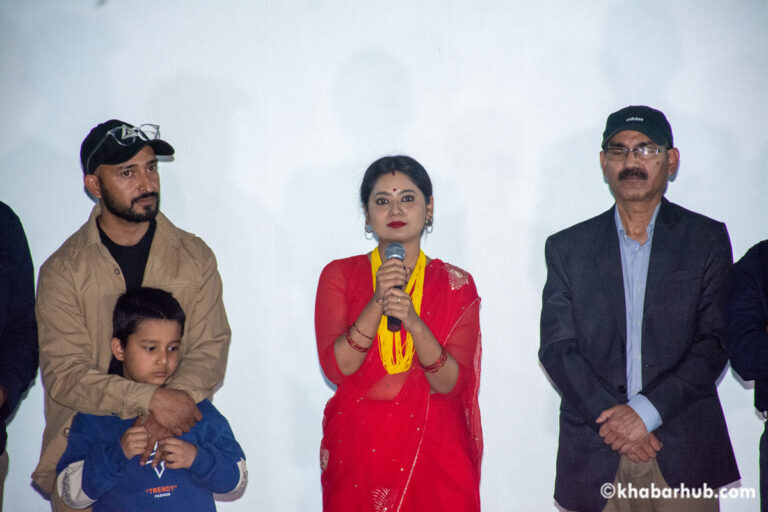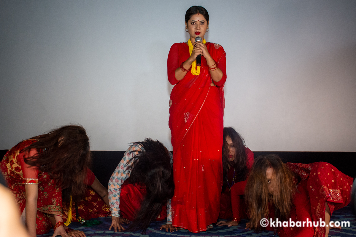 ती युवतीहरूको झुण्डलाई लिएर केकी फिल्मको चरित्र निर्वाह गर्दै मञ्चमा पुगेर उपस्थित अतिथिलाई सम्बोधन गरेकी थिइन् ।