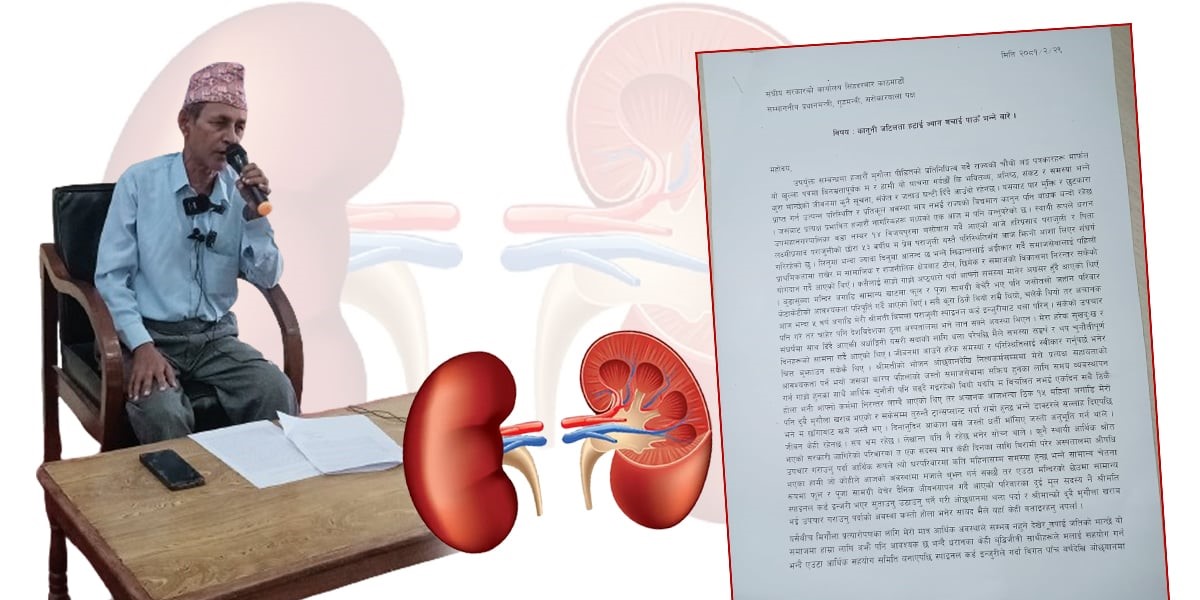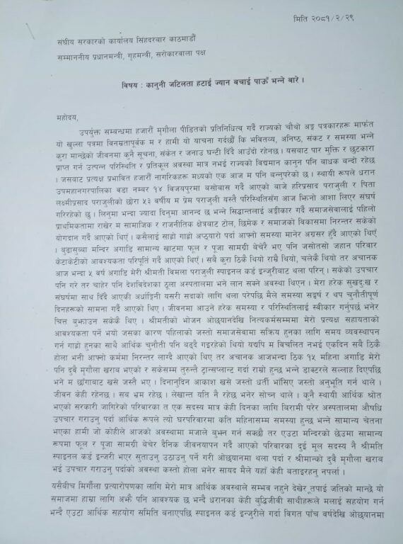उनले पत्रमा यो पनि लेखेका छन्, ‘म र हामी यो याचना गर्दछौं कि भवितव्य, अनिष्ट, सङ्कट र समस्या भन्ने कुरा मान्छेको जीवनमा कुनै सूचना, संकेत र जनाउ घन्टी दिँदै आउँदो रहेनछ । यसबाट मुक्ति र छुटकारा प्राप्त गर्न उत्पन्न परिस्थिति र प्रतिकूल अवस्था मात्र नभई राज्यको विद्यमान कानुन पनि बाधक बन्दो रहेछ । कानुनले नचिने पनि समाजमा परिचित मेरो धर्मपुत्रका रूपमा रहेको सन्तानले पनि स्वतःस्फुर्त रूपमा मलाई मृगौला प्रदान गर्न तयार भएर बसेका छन् । तर परिवारका सदस्यभन्दा बाहिरका व्यक्तिले कानुनी रूपमा दिन नमिल्ने रहेछ ।’