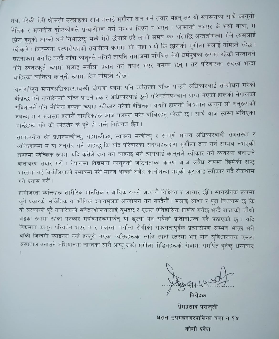 मृगौला प्रत्यारोपण गर्ने प्रयासमा नेपालको कानून नै बाधक बनेपछि उनले लेखेको खुलापत्रमा भनेका छन्, ‘म यो अनुरोध गर्न चाहन्छु कि यदि परिवारका सदस्यहरूद्वारा मृगौला दान गर्न सम्भव नभएको खण्डमा स्वैच्छिक रूपमा यदि कसैले दान गर्न चाहान्छ भने त्यसलाई कानूनले स्वीकार गर्ने व्यवस्था बनाउने वातावरण तयार गरौं । नेपालमा विद्यमान कानूनको जटिलताको कारण आज अवैद्य रूपमा छिमेकी राष्ट्र भारतमा गई विचौलियाको प्रभावमा परी मानव अङ्गको अवैद्य कालोधन्दा भएको सत्य स्वीकार गर्दै रोकथाम गर्ने प्रयास गरौं ।’