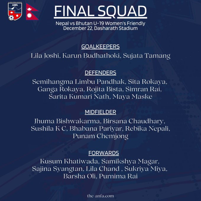 काठमाडौं– भुटानसँग हुने मैत्रीपूर्ण खेलका लागि नेपालको यु–१९ महिला टोली घोषणा गरिएको छ ।