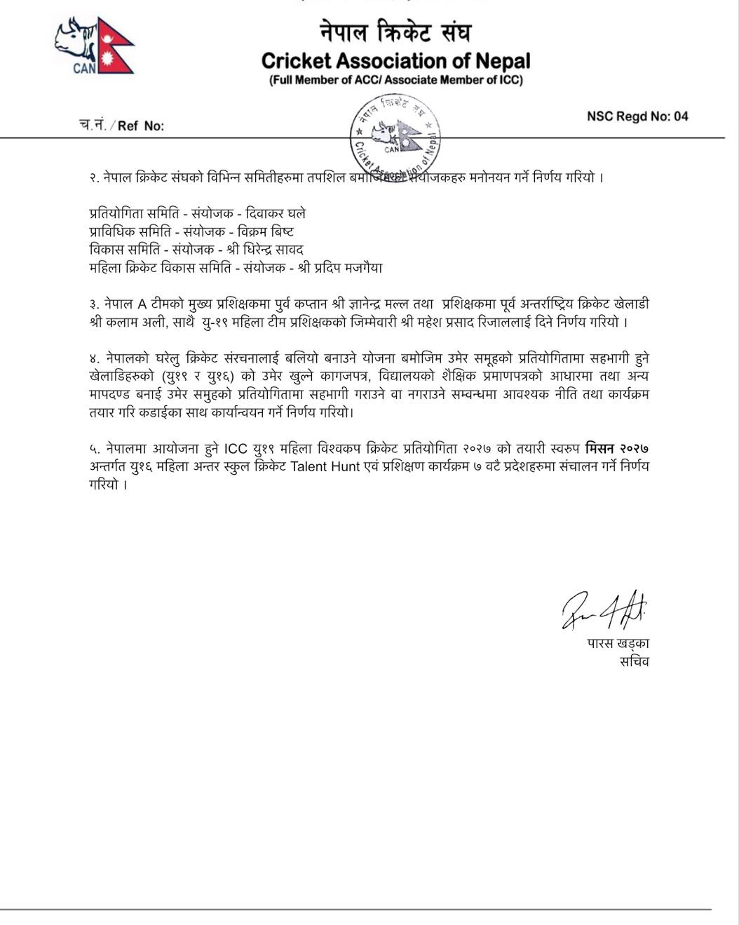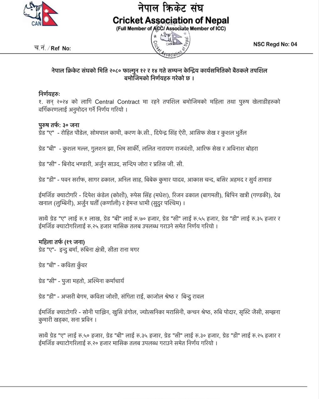 क्यानको सोमबार बसेको बैठकले पुरुष र महिला खेलाडीहरूको वर्गीकरण गर्नुका साथै उनीहरूको मासिक तलब तोकेको हो । ग्रेड ‘ए’मा कप्तान रोहितकुमार पौडेलसँगै सोमपाल कामी, करण केसी, दीपेन्द्र सिंह ऐरी, आसिफ शेख र कुशल भुर्तेल छन् ।