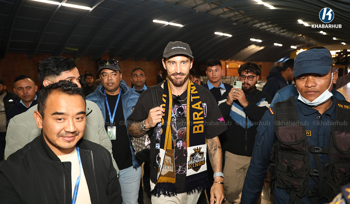 काठमाडौं– साउथ अफ्रिकन क्रिकेट खेलाडी फाफ डुप्लेसिस नेपाल आइपुगेका छन् । एनपीएल सिजन : २ मा विराटनगर किङ्ग्सबाट खेल्न उनी सोमबार काठमाडौं आएका हुन् । प्रकाशित मिति : १५ मंसिर २०८२, सोमबार ५ : ४२ बजे