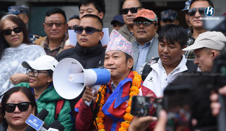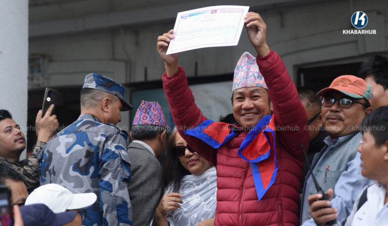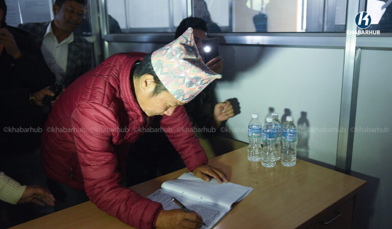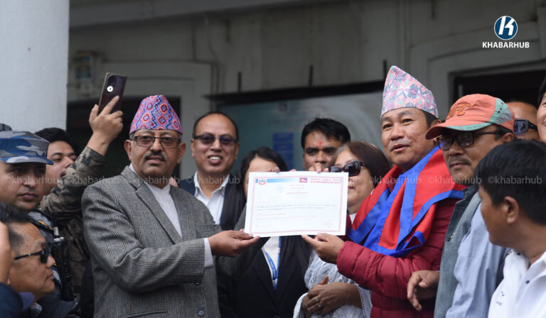 आज निर्वाचन आयोगमा पार्टीको मान्यताको प्रमाणपत्र ग्रहण गर्न साम्पाङ स्वयम् उपस्थित भएका छन् ।