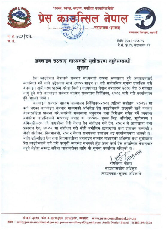 काठमाडौं- प्रेस काउन्सिल नेपालले अबदेखि अनलाइन सञ्चार माध्यमको सूचीकरण नगर्ने भएको छ।
