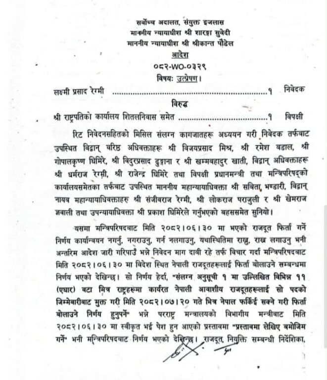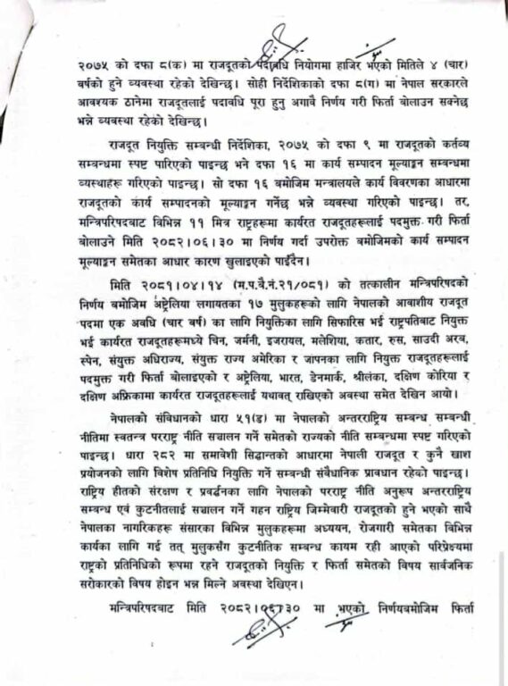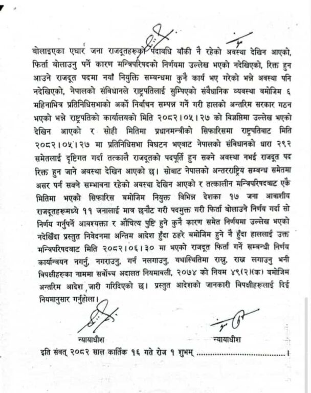अदालतले मन्त्रिपरिषद्को मिति २०८२ असोज ३० को निर्णयलाई कार्यान्वयन नगर्न आदेश दिएको हो। उक्त निर्णयमार्फत सरकारले चीन, अमेरिका, जापान, साउदी अरब, रुसलगायत ११ मित्रराष्ट्रमा कार्यरत नेपाली राजदूतहरूलाई पदमुक्त गरी फिर्ता बोलाउने निर्णय गरेको थियो।