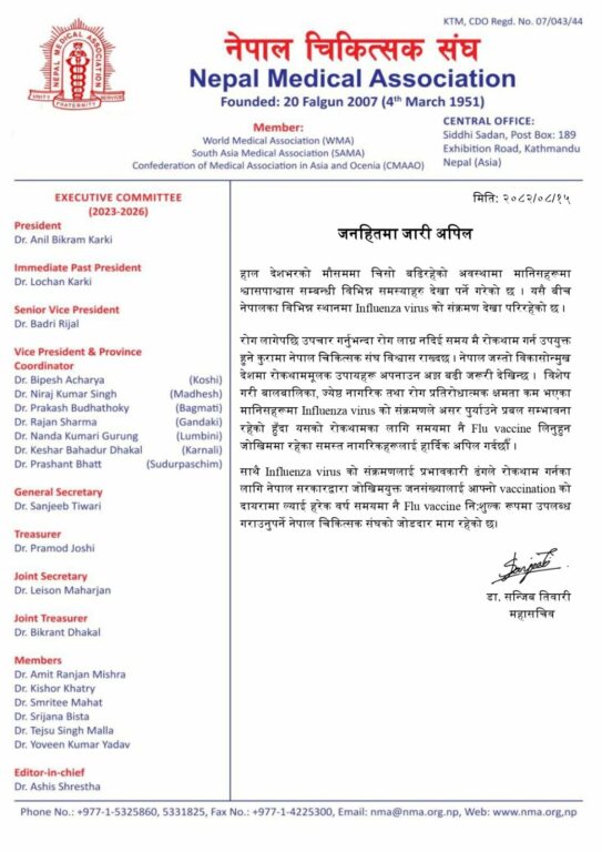 काठमाडौं– नेपाल चिकित्सक संघले चिसो मौसम सुरु भएसँगै ‘इन्फ्लुएन्जा भाइरस’को संक्रमणको जोखिम बढेको भन्दै सर्वसाधारणलाई सतर्क रहन अपिल गरेको छ ।