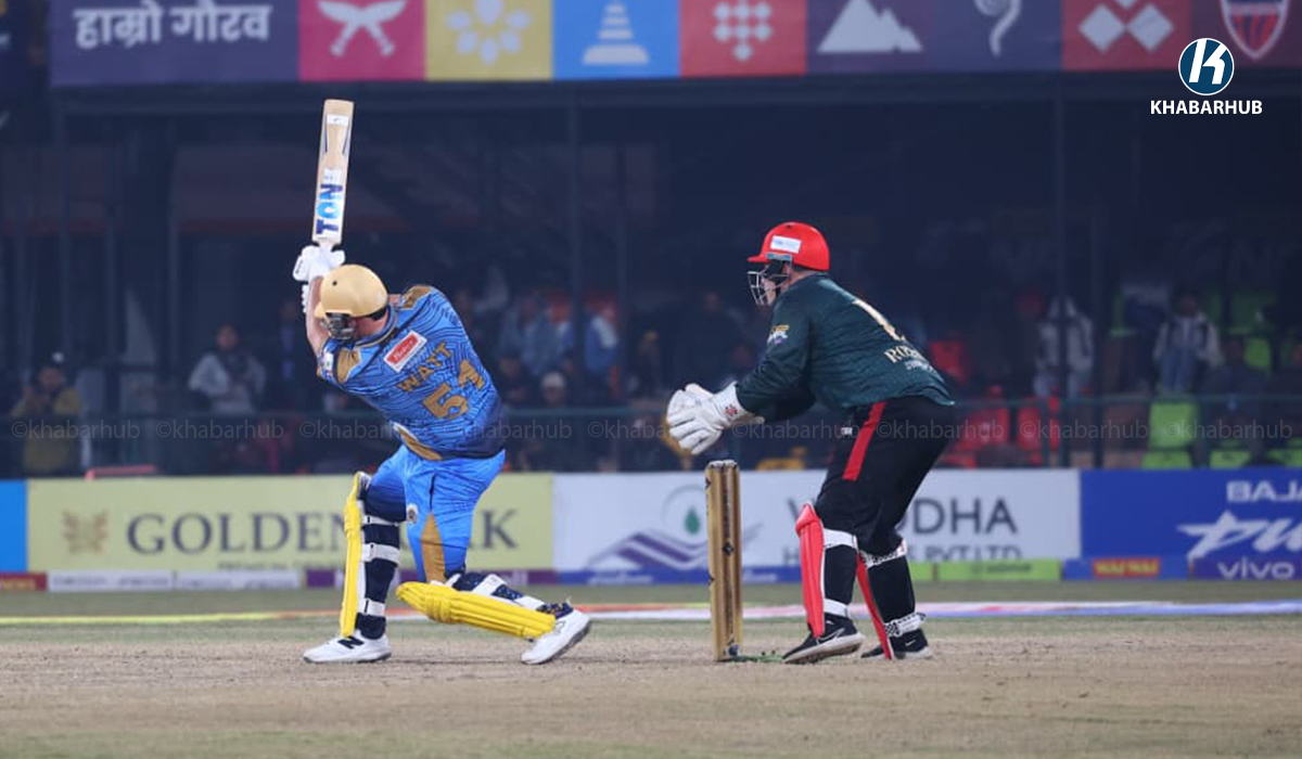 काठमाडौं- पोखरा एभेन्जर्सले दिएको विशाल लक्ष्य पछ्याउने क्रममा अर्धशतक प्रहार गरेका ब्याटर मार्क वाट आउट भएपछि कर्णाली याक्सलाई तेस्रो धक्का लागेको छ ।