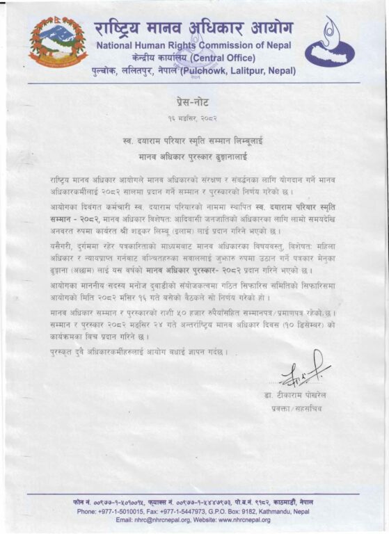 आयोगले उनीहरूलाई २०८२ मंसिर २४ गते अन्तर्राष्ट्रिय मानव अधिकार दिवसका अवसरमा आयोजित कार्यक्रमका बीच सम्मानित गर्ने बताएको छ।