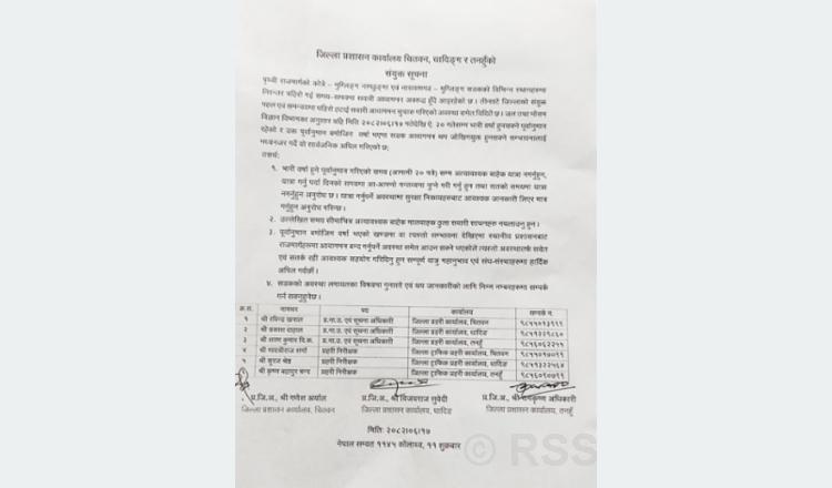 भारी वर्षा हुने पूर्वानुमान गरिएको समय (आगामी २० गते) सम्म अत्यावश्यकबाहेक यात्रा नगर्नुहुन, यात्रा गर्नुपर्दा दिनको समयमा आ–आफ्नो गन्तव्यमा पुग्नेगरी गर्नु हुन तथा रातको समयमा यात्रा नगर्नूहुन अनुरोध गरिएको तनहुँका प्रमुख जिल्ला अधिकारी रामकृष्ण अधिकारीले जानकारी दिए । उनका अनुसार यात्रा गर्नुपर्ने अवस्थामा सुरक्षा निकायबाट आवश्यक जानकारी लिएर मात्र गर्नुहुन अनुरोध गरिएको छ ।