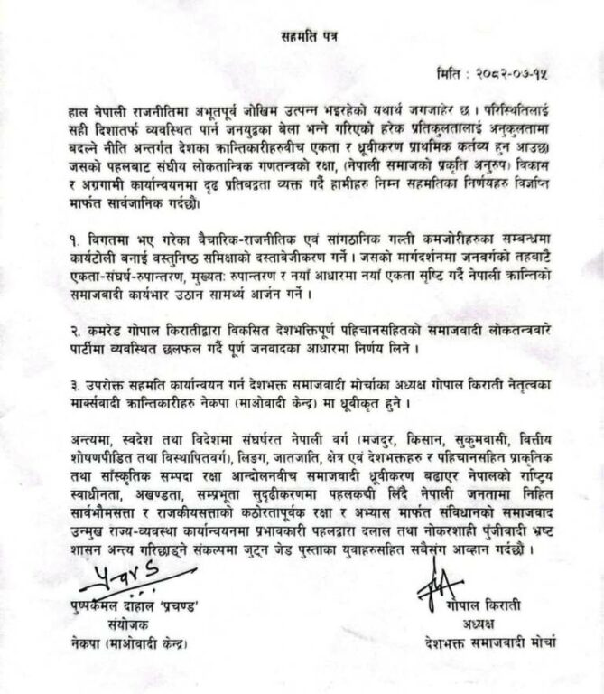 सहमतिमा माओवादी केन्द्रका संयोजक पुष्पकमल दाहाल ‘प्रचण्ड’को र किरातीको हस्ताक्षर रहेको छ। २०७५ मा माओवादी र एमालेबीच एकता भएर नेकपा बनेपछि किरातीले नयाँ पार्टी बनाएका हुन् ।