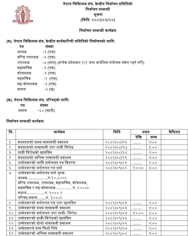 काठमाडौं– नेपाल चिकित्सक संघको केन्द्रीय कार्यकारिणी समितिको निर्वाचन आगामी माघ महिनामा हुने भएको छ ।