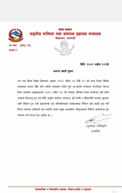 जल तथा मौसम विज्ञान विभागले असोज १७ देखि २० गतेसम्म देशका विभिन्न भागमा मध्यमदेखि भारी वर्षा हुने अनुमान गरेकाले कार्यालय प्रमुखहरू तत्काल जिम्मेवारीमा फर्कनु पर्ने भनेको हो ।