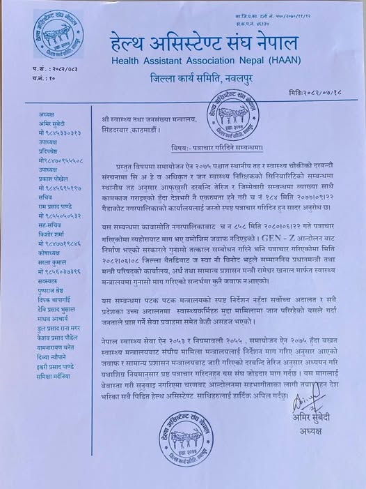‘यदि मन्त्रालयले अब पनि सुनुवाइ नगरेमा, देशभरका हेल्थ असिस्टेन्टहरू चरणबद्ध आन्दोलनमा उत्रनेछन्।’ पत्रमा चेतावनी दिइएको छ ।