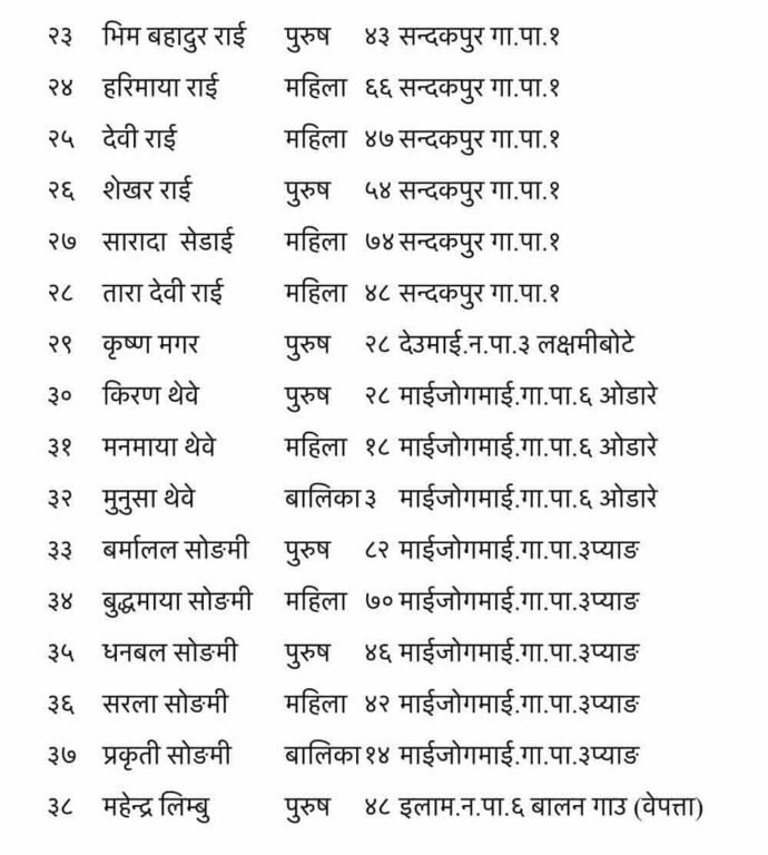 यस्तै, देउमाई नगरपालिका–५ का २२ वर्षीय रोशन लिम्बू, २२ वर्षीया बेबिसा राई, ३० वर्षीय दीपक लिम्बू, २७ वर्षीया ऋषिका लिम्बू, १० वर्षीया दिपिस्का लिम्बू, देउमाई–३ का २८ वर्षीय कृष्ण मगर र माई नगरपालिका–५ की ८ वर्षीया प्रिन्सिखा मगरको ज्यान गएको छ ।