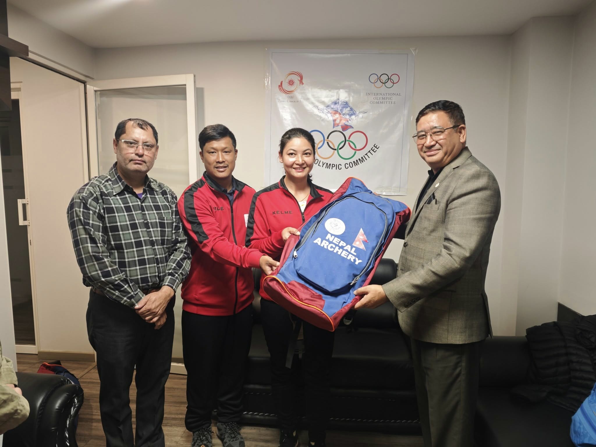 एनओसीका अध्यक्ष श्रेष्ठले दुवै खेलाडीलाई खेल सामाग्री हस्तान्तरण गर्दै राम्रो प्रदर्शन गर्न शुभकामना दिए ।