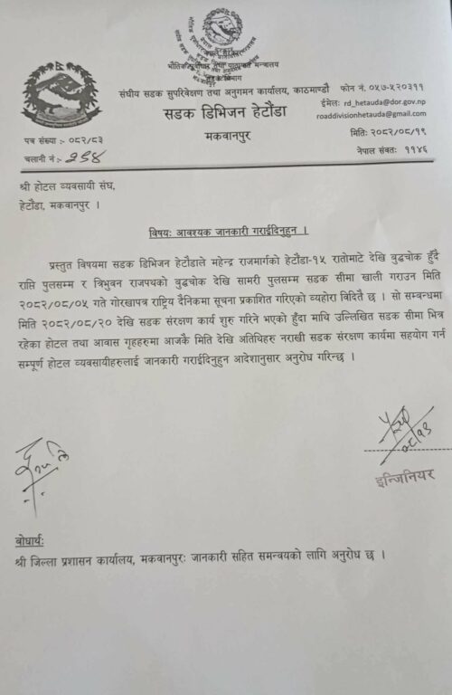 शुक्रबार एक विज्ञप्ति जारी गर्दै हेटौंडा–१५ रातोमाटेदेखि बुद्धचोक हुँदै राप्ति पुलसम्म महेन्द्र राजमार्ग र बुद्धचोकदेखि सामरी पुलसम्म त्रिभुवन राजपथको सडक सीमा खाली गराउने काम सुरु हुन लागेको जानकारी दिएको हो ।