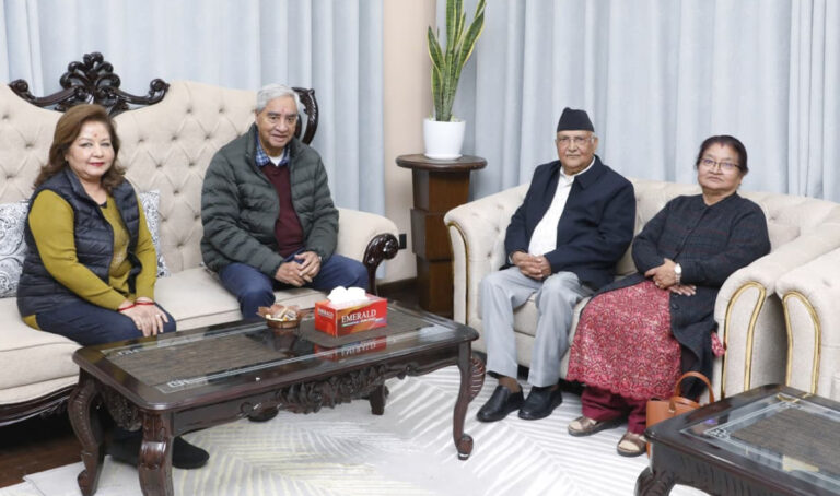 दुई नेताबीचको छलफलमा देउवा पत्नी एवम् पूर्वपरराष्ट्रमन्त्री डा. आरजु राणा र ओली पत्नी राधिका शाक्य पनि सहभागी छिन् ।