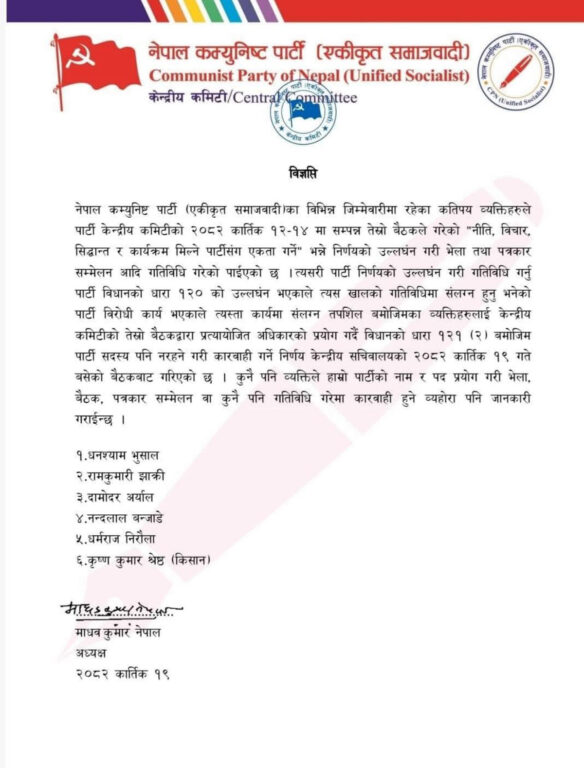 विज्ञप्तिमा पार्टी निर्णयविपरीत गतिविधिमा संलग्न भएकाले घनश्याम भुसाल, रामकुमारी झाँक्री, दामोदर अर्याल, नन्दलाल बन्जाडे, धर्मराज निरौला र कृष्णकुमार श्रेष्ठ (किसान) लाई निष्कासन गरिएको हो।